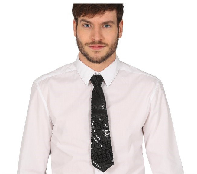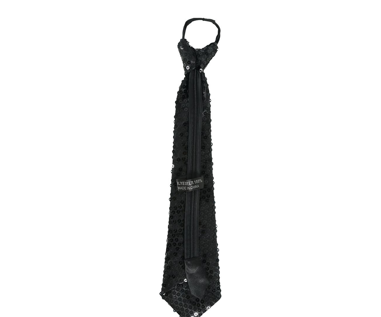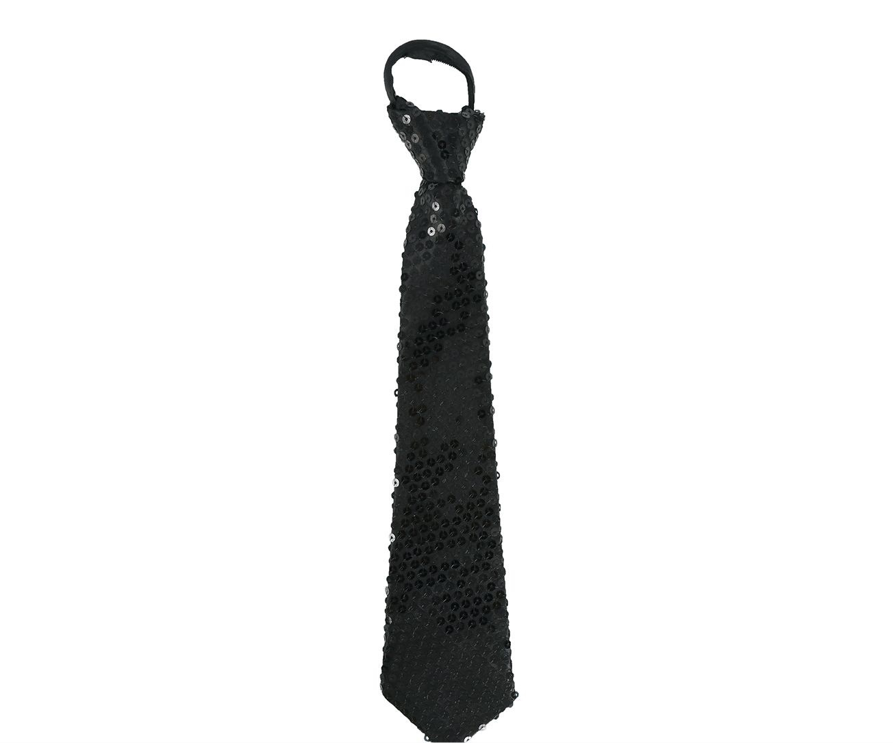 - Krawat wykonany z czarnego, połyskującego materiału. Obszyty jest cekinami, które nadają dodatkowej elegancji. Krawat mocowany i regulowany jest na zamek błyskawiczny. Krawat posiada stałe wiązanie.