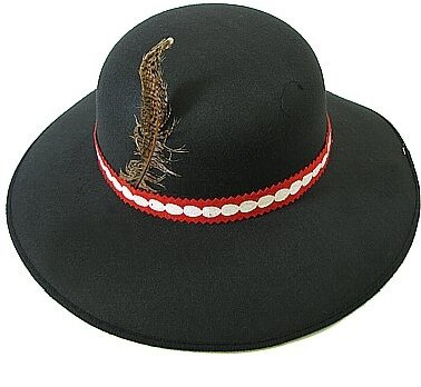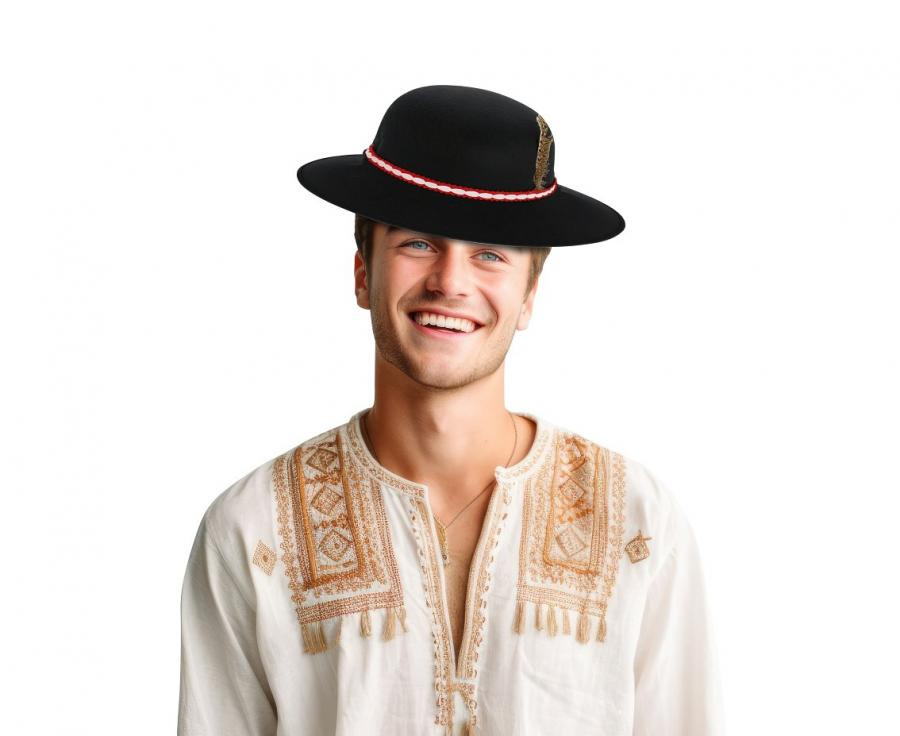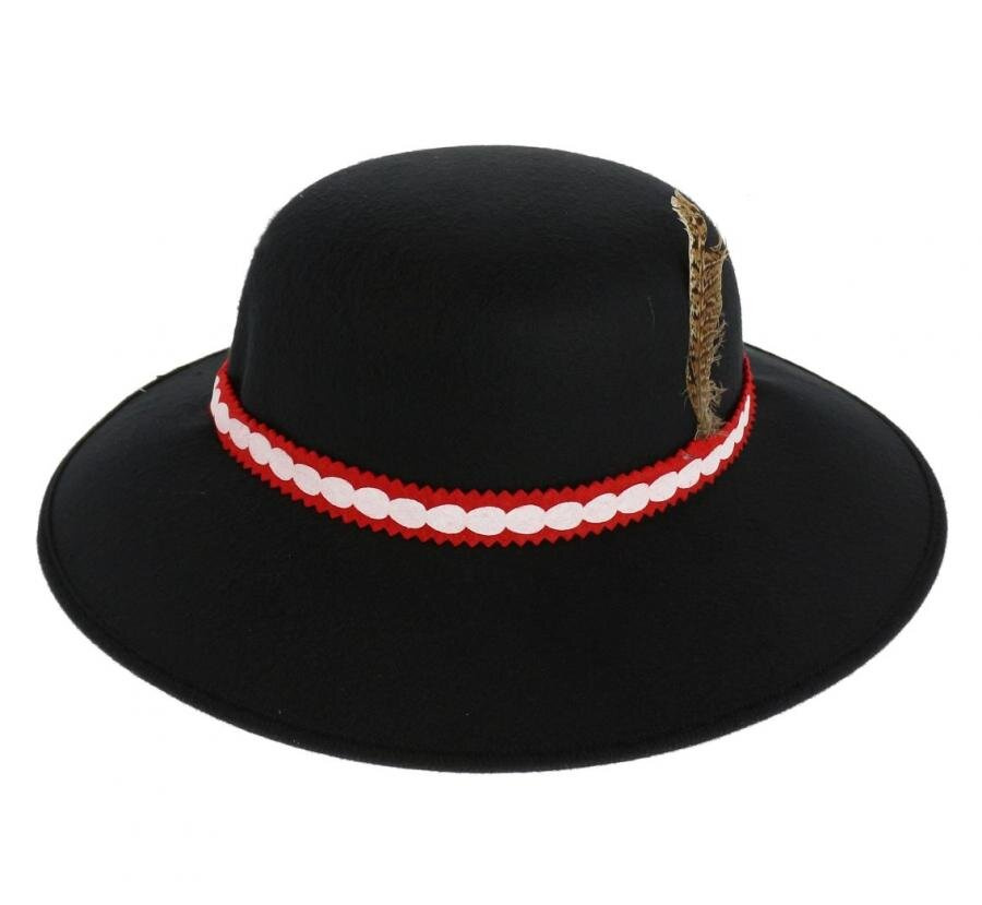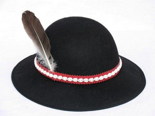 • Kapelusz wykonany ze sztywnego filcu, posiada czerwono białą lamówkę wokół, do której przymocowane jest brązowe piórko. Znakomite dopełnienie przebrania górala, bacy, pasterza zwłaszcza na jasełka.