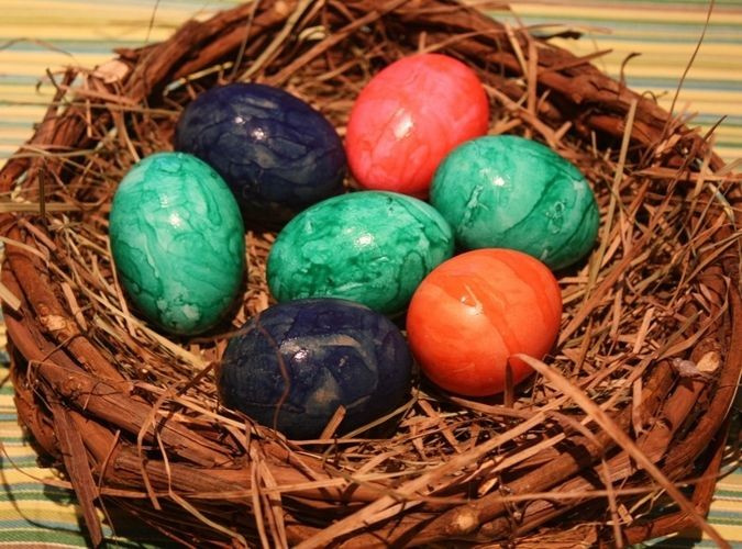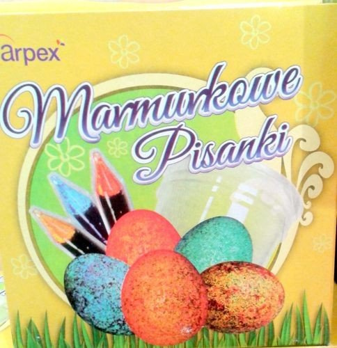• Marmurkowe Pisanki. Zestaw zawiera m barwniki w płynie: czerwony, niebieski i żółty, 3 pojemniki plastikowe, rękawice, 100 g ryżu do farbowania.