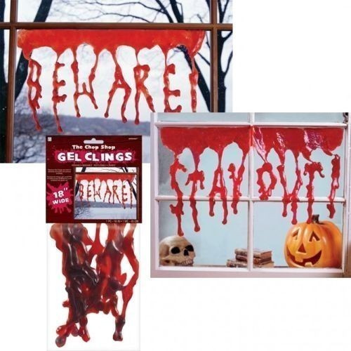 Żelowa dekoracja w czerwonym kolorze prezentująca krwawy napis BEWARE (ang. Strzeż się). Ozdobę można przykleić do szyby, lutra lub innych gładkich powierzchni, nie zaleca się przyklejania do drewna, ścian i materiałów. Napis może być wielokrotnie wykorzystywany, po użyciu należy opłukać go wodą i po wyschnięciu schować. Krwawe ślady zrobią przerażające wrażenie na gościach, a jednocześnie świetnie udekorują pomieszczenie, niczym scena z horroru lub miejsca zbrodni.