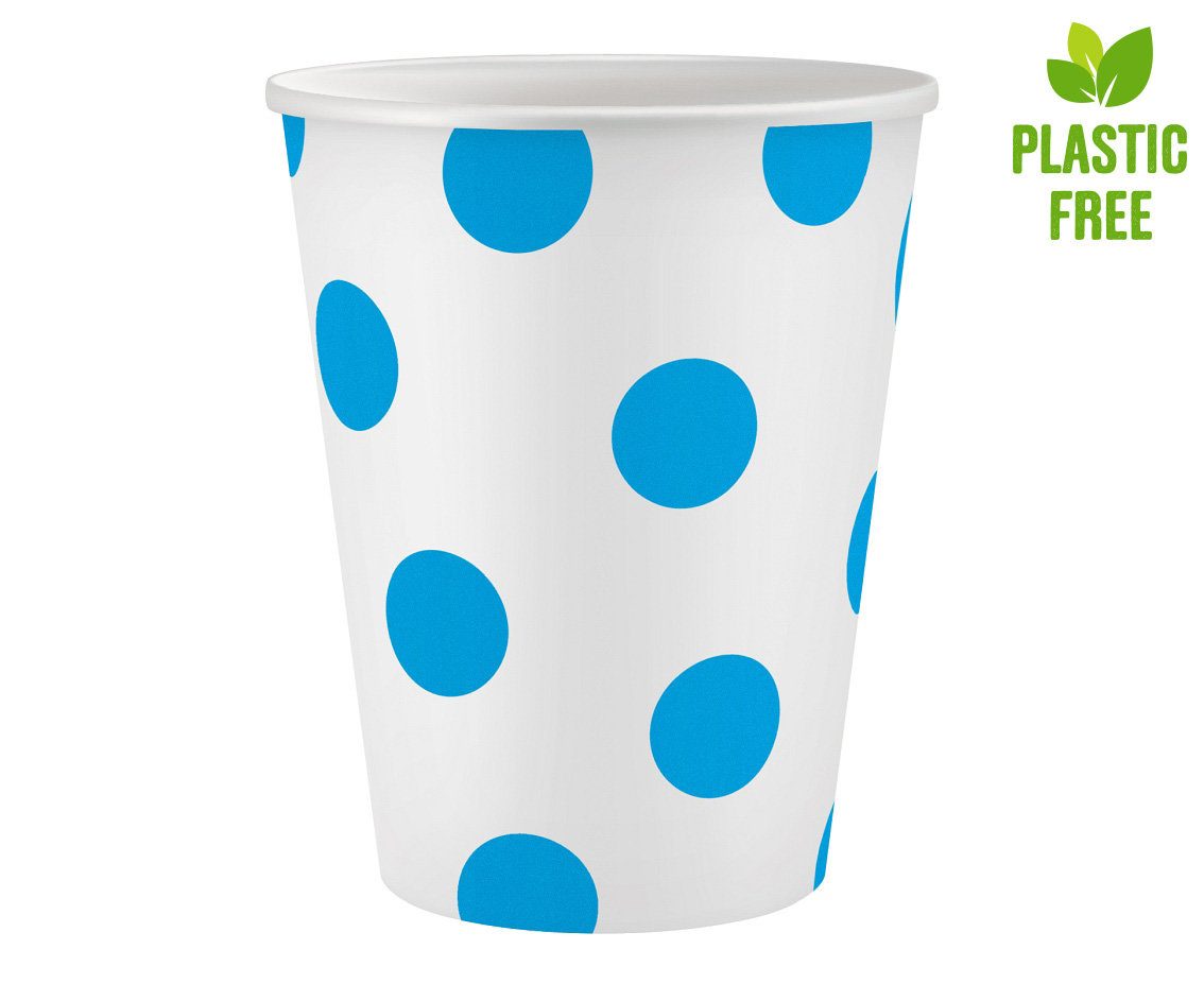 • Kubeczki papierowe w białym kolorze z nadrukiem niebieskich kropek.