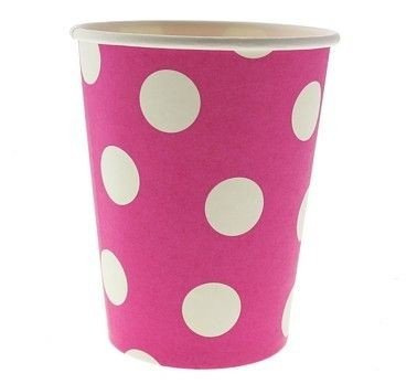 - Kubeczki papierowe w intensywnym różowym kolorze z nadrukiem w białe groszki. Kubki doskonale nadają się jako dopełnienie dekoracji stołu podczas Baby Shower z okazji narodzin dziewczynki, roczku, urodzin.