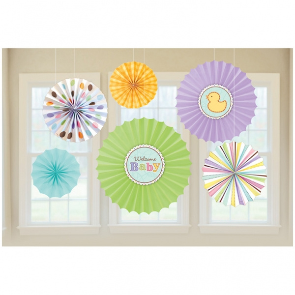 Bardzo efektowne rozetki tekturowe do powieszenia w lokalu lub w domu pod sufitem, lampą, na oknie lub łóżeczkiem nowego członka rodziny. Dekoracje są w miłych pastelowych kolorach: 3 jednokolorowe (niebieska, zielona i fioletowa), 3 z ozdobnym nadrukiem. Do zestawu dołączone są dyski z atrybutem małego dziecka: żółta kaczuszka oraz napis "Welcome Baby". Dyski można założyć na dowolne wachlarze.