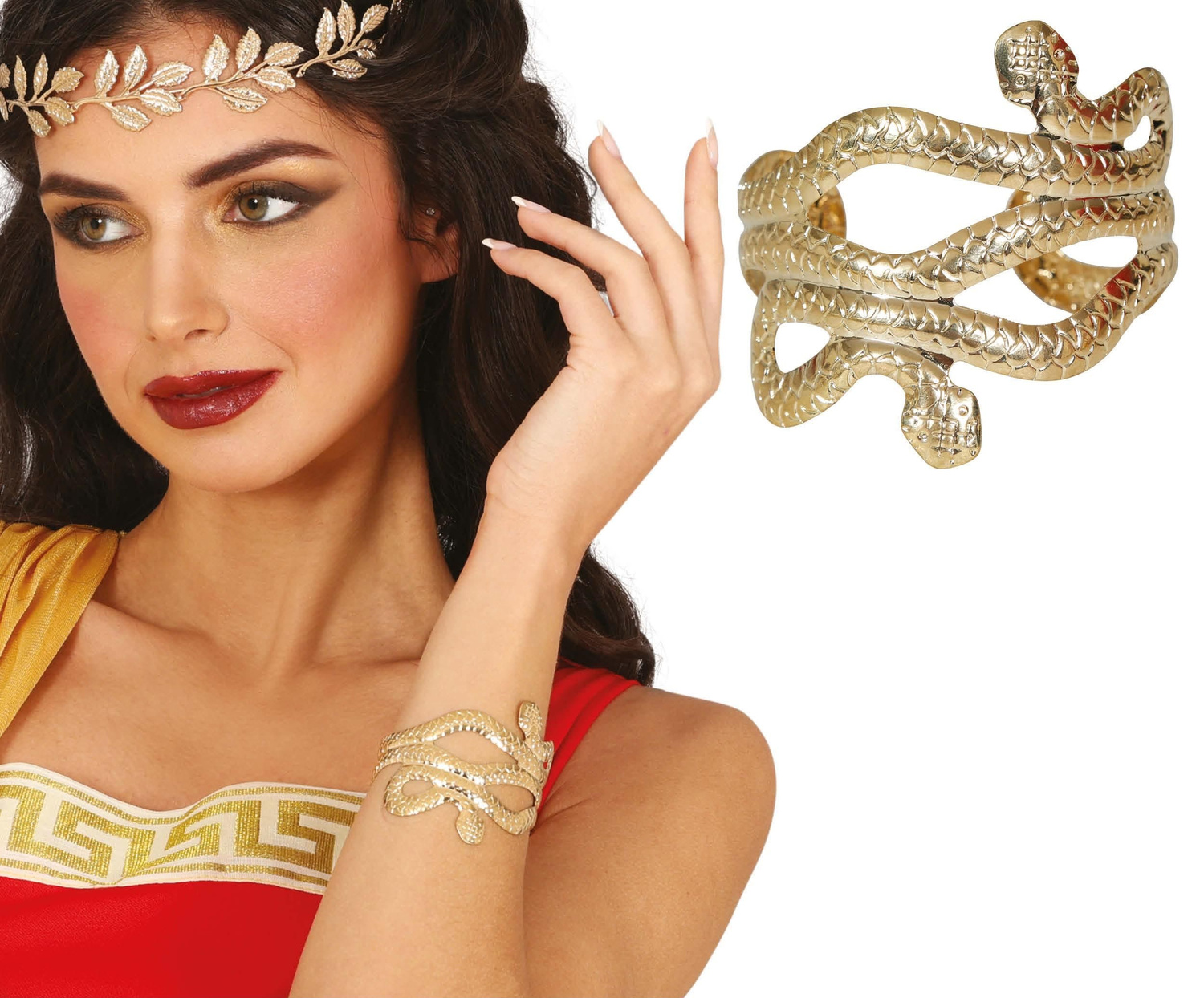 Nadaj swojej stylizacji antycznego charakteru z tą efektowną bransoletką w kształcie węża. Wykonana z lekkiego, złotego metalu idealnie oplata nadgarstek lub przedramię, przyciągając wzrok i dodając realizmu starożytnemu kostiumowi. Bransoleta posiada kształt wijącego się węża z subtelną fakturą łusek. Idealna do kostiumów greckich, rzymskich, egipskich oraz fantasy (np. Meduzy, bogini, kapłanki, faraonki).