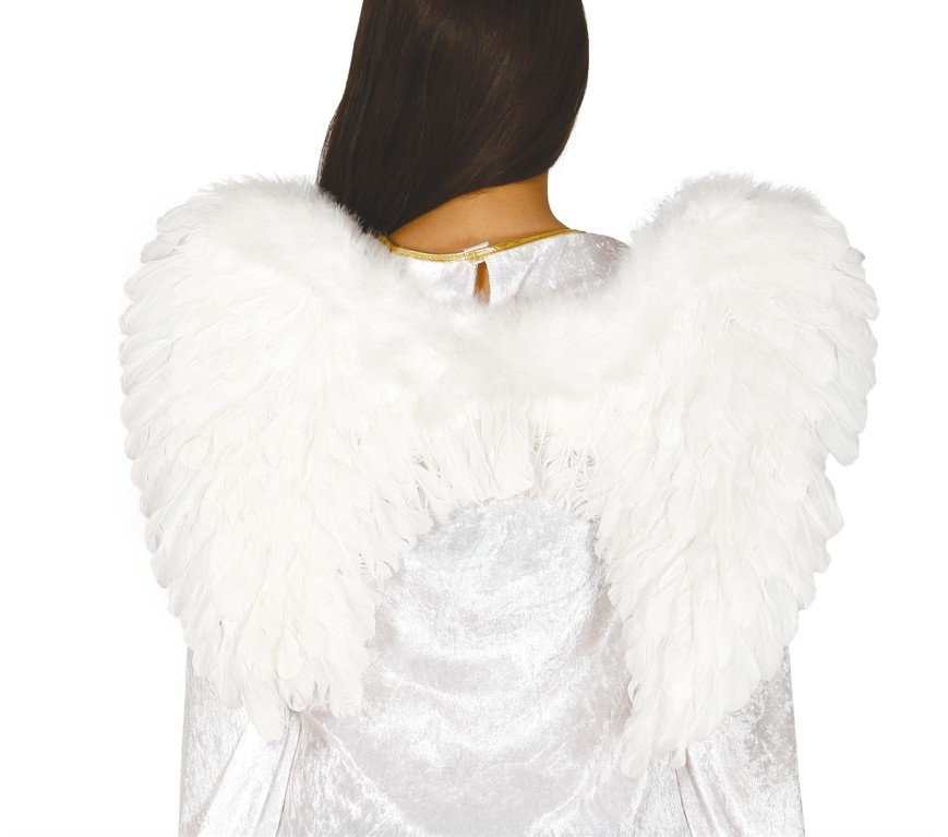 Skrzydła anioła w białym kolorze wykonane z tektury, która ozdobiona jest piórkami i białym boa. Posiadają gumkę do przymocowania, zakładane jak plecak. Skrzydełka są doskonałym uzupełnieniem stroju aniołka na jasełka, bal Wszystkich Świętych i Boże Narodzenie.
