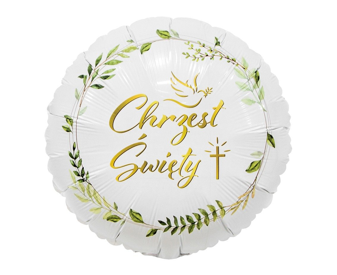 Okrągły balon foliowy w białym kolorze z nadrukiem złotego napisu Chrzest Święty, krzyżyka oraz gołąbka. Dookoła balonu nadruk gałązek oliwnych. Znakomita jako dekoracja na przyjęcia z okazji przyjęcia sakramentu chrztu. Balon przeznaczony do napełniania helem - unosi się wówczas w powietrzu.