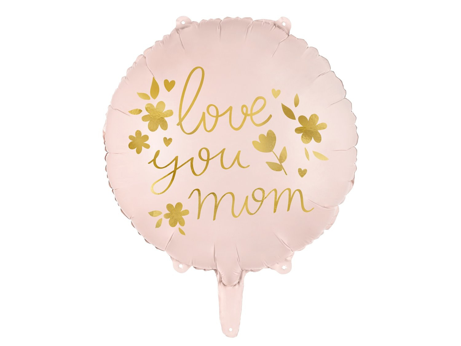 Balon foliowy na prezent dla mamy na każdą okazję, zwłaszcza z okazji Dnia Mamy. Balon jest w różowym, pastelowym kolorze ze złotym, lustrzanym napisem "Love you mom" (Kocham Cię Mamo).