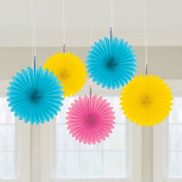 Bardzo efektowne rozetki papierowe do powieszenia w domu pod sufitem, lampą, w oknie lub nad łóżeczkiem nowego członka rodziny. Wachlarzyki są jednokolorowe w żółtym kolorze.
