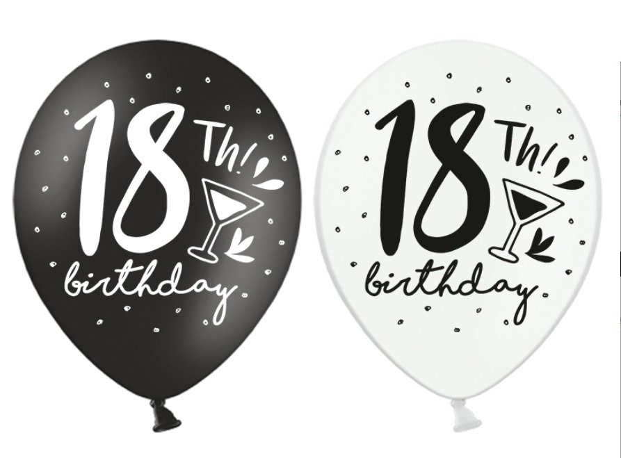 Balony gumowe z nadrukiem cyfry 18 i napisu Birthday z kropeczkami i kieliszkiem. Balony są w białym i w czarnym kolorze, mają średnicę ok 36 cm i można napełniać je zarówno helem jak i powietrzem.