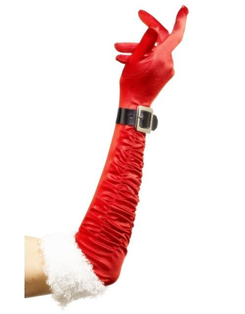 Rękawiczki pięciopalczaste o długości za łokieć w kolorze czerwonym zakończone białym futerkiem. Rękawiczki uszyte są z połyskującego satynowego materiału, na przedramieniu wszyte mają gumki dzięki którym elegancko się marszczą. Nadgarstek zdobi czarny pasek z klamrą z możliwością regulacji.