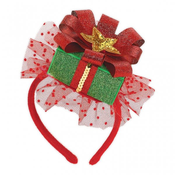 - Efektowny prezencik na opasce. Prezent jest zielony pokryty brokatem z czerwoną brokatową wstążką i kokardą. Pod prezentem wystaje czerwony tiulowy materiał. Kapelusik doda uroku w Święta Bożego Narodzenia. Rozmiar uniwersalny.