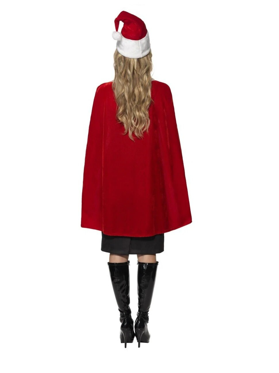 Peleryna wykonana jest z miękkiego, czerwonego materiału, wykończona białym kożuszkiem. Zawiązywana z przodu. W zestawie znajduję się również czerwona czapka z białym pomponem ozdobiona białym futerkiem.
