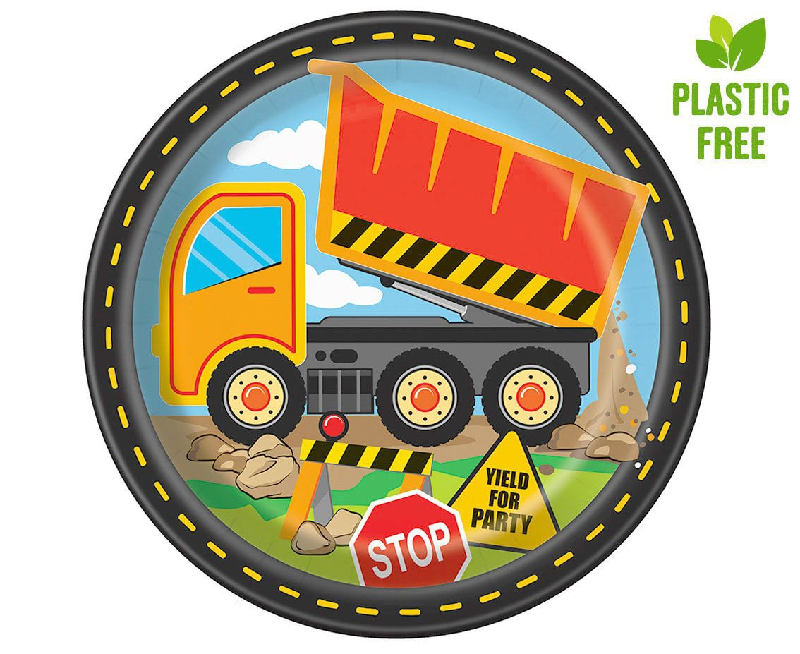 Talerzyki jednorazowe z serii "Budowa". Talerzyki mają obwódkę w stylu czarno-żółtej drogi oraz na środku nadruk wywrotki na tle placu budowy. Talerze są gładkie z lekkim wgłębieniem. Idealne do przekąsek, owoców, tortu na każdą okazję min. na urodzinki lub zabawę tematyczną dla wielbicieli wielkich maszyn budowlanych.