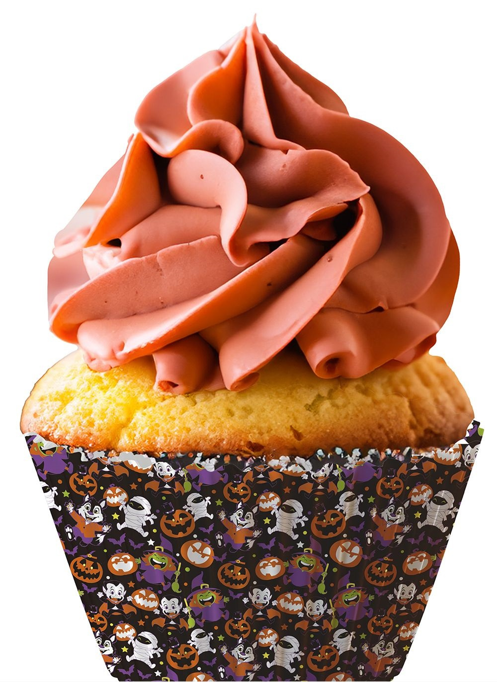 Ozdobne, papierowe foremki do muffinek lub babeczek z motywem Halloween. Na papilotkach widnieje kolorowy nadruk: dyni z wyciętymi buźkami (jack-o’-lantern), duszkami, mumiami, nietoperzami, wampirkami i czarownicami. Całość na czarnym tle. Znakomite do pieczenia i dekorowania babeczek, muffinek, a także jako dekoracyjna osłonka do słodyczy i przekąsek. Foremki mogą być używane w temperaturze -40*C - 220*C.