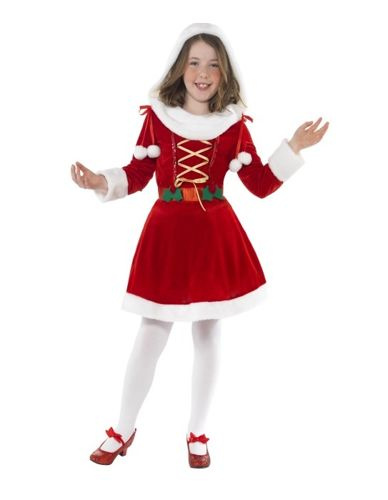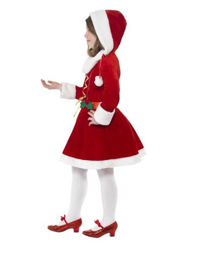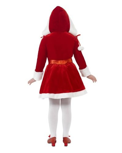 Śliczna czerwona sukienka z długim rękawem i kapturem wykonana z welurowego materiału. Dekolt, obwód kaptura, mankiety oraz dół spódnicy zdobi białe futerko. Na sukience naszyte są złote tasiemki imitujące wiązanie gorstetu, w pasie wszyty czerwony pasek z regulacją z tyłu na rzep oraz ozdobiony świątecznymi listkami i owocami gwiazdy betlejemskiej. W pasie, na plecach wszyta zostałą gumka dla lepszego dopasowania. Przy dekolcie z obu stron przyszyta jest tasiemka z dwoma pomponami. Przy spódnicy wszyta jest poliestrowa halka wraz z tiulową falbaną dzięki której nabiera objętości. Sukienka zapinana jest na karku na rzep.