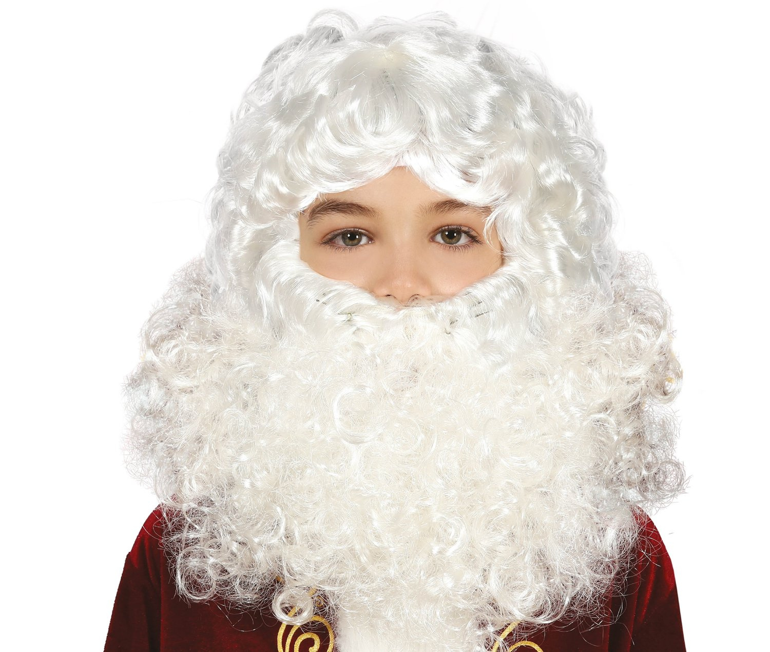 Uzupełnienie charakteryzacji przebrania Świętego Mikołaja lub Dziadka Mroza dla dziecka. W komplecie peruka oraz broda w śnieżnobiałym kolorze, połyskujące. Charakteryzacja wykonana ze sztucznych, długich kręconych włosów.
