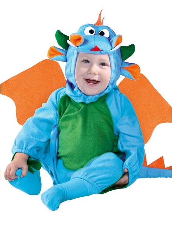 Jednoczęściowy kombinezon pluszowego smoka wraz z czapeczką i skrzydełkami. Kombinezon jest w niebieskim kolorze, z wszytym na brzuszku zielonym materiałem. Rękawki długie przy mankietach zakończone imitacją smoczych łap z trzema paluchami. Z tyłu posiada doszyty na stałe, wypchany ogon. Strój zapinany jest na plecach na rzepy, dodatkowo posiada rozpinane całe nogawki (także na rzep) co ułatwia skorzystanie z toalety lub zmianę pieluszki. Przebranie dopełnia niebieska czapeczka - głowa smoka, z uszkami, rogami, noskiem, oczkami i ząbkami. Wokół twarzy wszyta gumka. Czapka zapinana pod brodą na rzep. Uzupełnieniem całości są pomarańczowe filcowe skrzydła przypinane na rzepy.