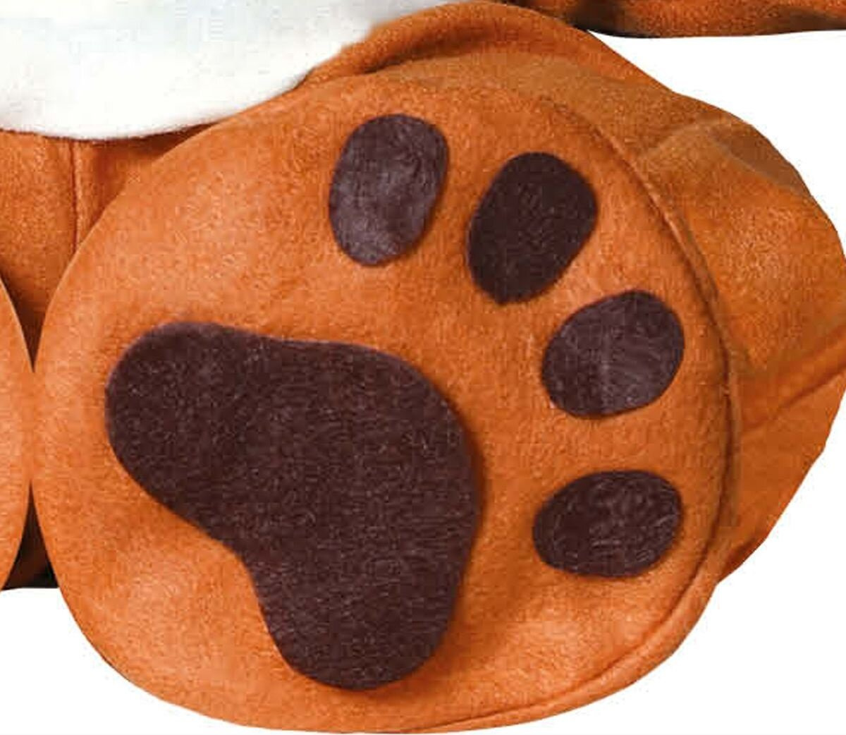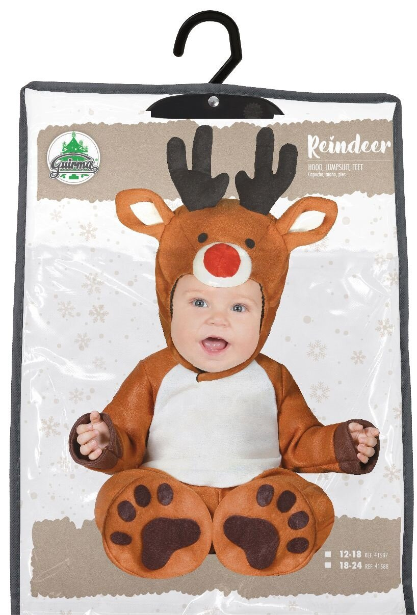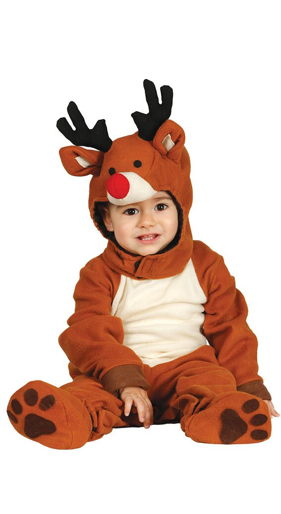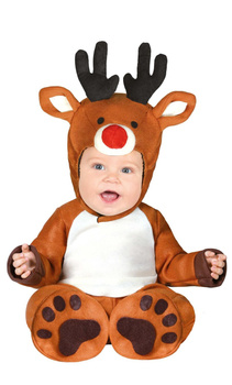 Przebranie składa się z jednoczęściowego kombinezonu z długim rękawem i nogawkami. Całość w kolorze jasno brązowym z beżowym brzuchem. Kostium wykonany jest z miłego materiału, z tyłu zapinany na zamek błyskawiczny, dodatkowo zabezpieczony rzepem. W kroku całościowe rozpięcie na rzep, dzięki któremu łatwiej zmienić pieluszkę. Czapka - kaptur uszyty jest z tego samego materiału co kombinezon, na czubku doszyta została pluszowa głowa renifera z odstającymi rogami, uszami oraz czerwonym nosem. Oczy przyklejone z filcu. Pod brodą zapinana na rzep. Całość dopełniają stopki - obszerne skarpety z przyklejonymi od spodu śladami łapek. Stopki posiadają gumkę w kostce, aby lepiej trzymały się na nóżkach.