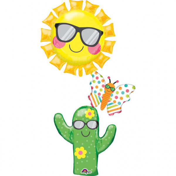 Olbrzymi balon foliowy o wysokości aż 160 cm. Balon składa się z 3 dużych połączonych ze sobą balonów w kształcie: kaktusa, motylka oraz słoneczka. Wszystkie elementy w przeciwsłonecznych okularach, posiadają ładne żywe barwy. Okazała dekoracja na każde letnie i wakacyjne przyjęcie, zwłaszcza w stylu meksykańskim i hawajskim. Balon najlepiej napełniać helem - unosi się wówczas pięknie w powietrzu.