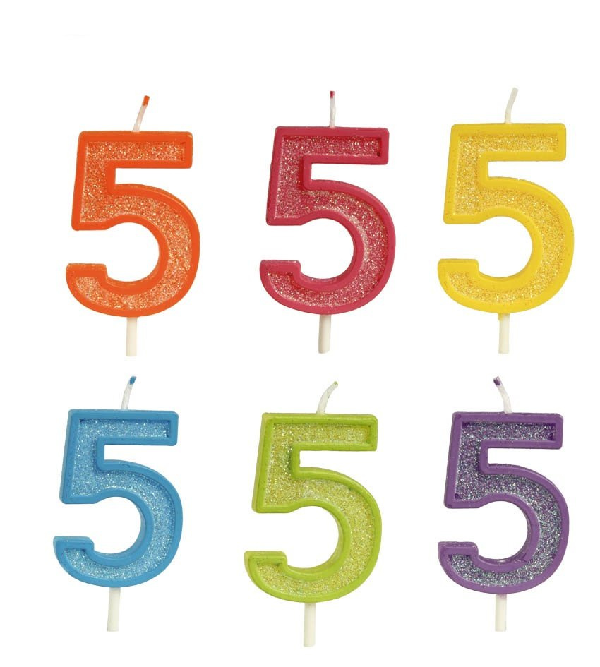 - Kolorowa świeczka z brokatem w kształcie cyferki 5. Świeczka mocowana na torcie urodzinowym lub rocznicowym na wykałaczce. Skompletowana z innymi cyframi tworzy dowolny numer.
