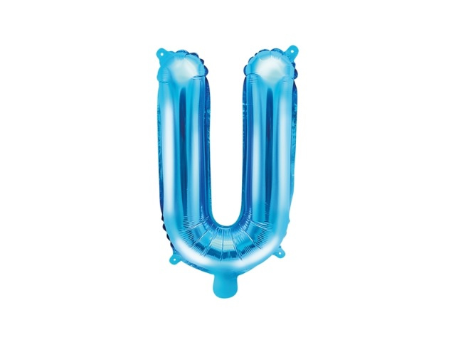- Balon foliowy w kształcie literki "U" w niebieskim kolorze. Złożony z innymi literami tworzy dowolny wyraz. Balon posiada otworki dzięki którym można przywiązać go np. do ściany czy futryny.