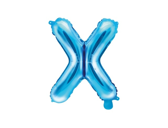 - Balon foliowy w kształcie literki "X" w niebieskim kolorze. Złożony z innymi literami tworzy dowolny wyraz. Balon posiada otworki dzięki którym można przywiązać go np. do ściany czy futryny.