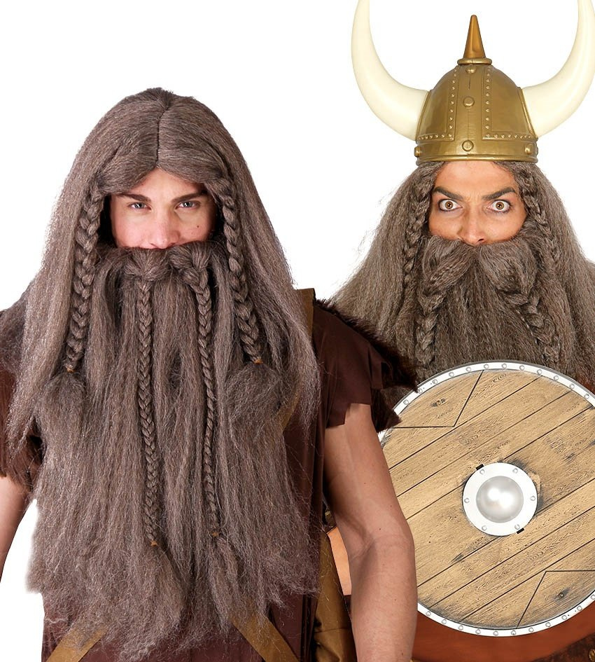 • Peruka z szarymi włosami lekko pokarbowanymi, fryzura z przedziałkiem z przodu uczesane dwa warkocze. W zestawie z długą brodą. Znakomite dopełnienie charakteryzacji wikinga, grubianina czy Zeusa.
