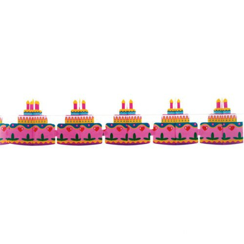 - Pozioma girlanda wykonana z kolorowej bibuły. Ozdoby mają kształt kolorowego tortu ze świeczkami. Torty są ze sobą połączone i umieszczone na białej gumce. Po rozłożeniu każdy tort wygląda jakby miał 5 świeczek. Girlanda ma długość 400 cm