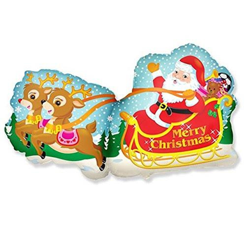 - Foliowy balon w kształcie sań Świętego Mikołaja ciągniętych przez dwa renifery. Na pokładzie Mikołaj z misiem oraz prezenty. Na saniach napis: Merry Christmas. Balon będzie super dekoracją na Mikołajki i Święta Bożego Narodzenia.