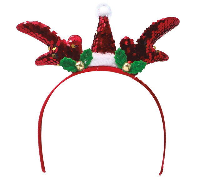 Dodatek, który doda uroku Świętom Bożego Narodzenia podczas rozdawania prezentów z pod choinki lub świąteczny gadżet np. na opłatek firmowy, czy wigilię klasową. Opaska do włosów pokryta jest materiałem w czerwonym kolorze. Do opaski przymocowane jest poroże renifera oraz mała czapeczka Świętego Mikołaja. Całość od przodu pokryta mieniącymi cekinami w czerwonym kolorze, przyozdobiona aplikacją w kształcie gwiazdy betlejemskiej.