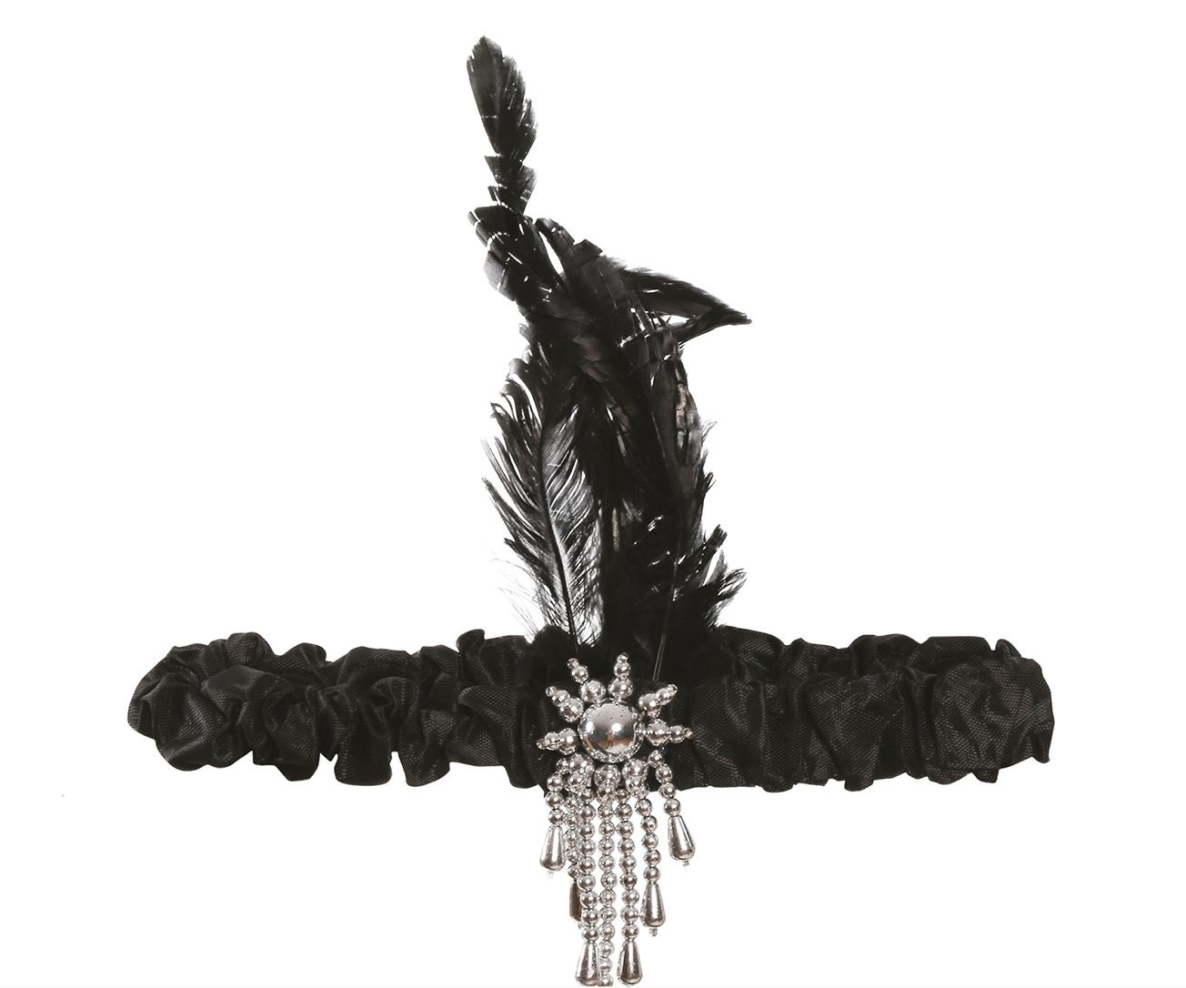 - Opaska na gumce obszytej czarnym matowym materiałem z doczepionym ozdobnym piórem w kolorze czarnym. Opaskę zdobi dodatkowo aplikacja ze srebrnych koralików. Idealna do przebrania z lat 20 i 30-stych.