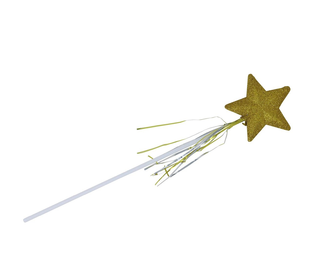 - Plastikowa różdżka ze złotą połyskującą gwiazdką. Gwiezdne berło dodatkowo zdobią złoto - srebrne paski połyskującej folii. Super dodatek do przebrania wróżki, księżniczki lub gwiazdki.