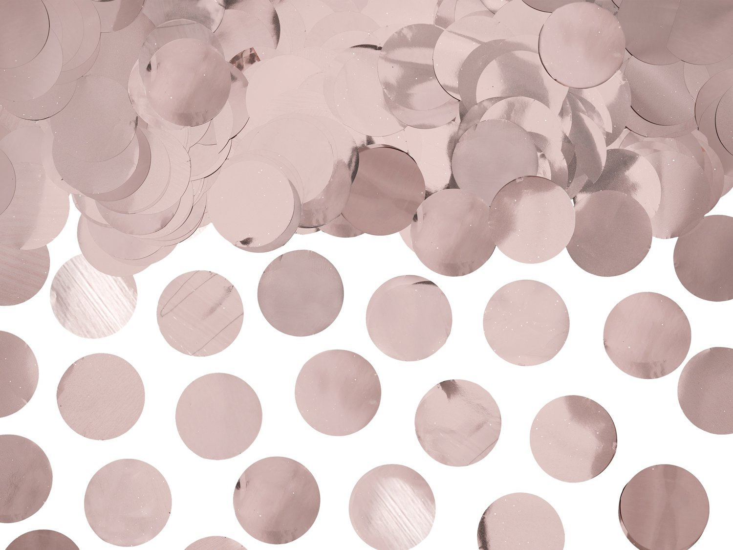 Okrągłe konfetti w kolorze pudrowego różu. Kropki mają dwustronny kolor, wykonane są z połyskującej foli. Średnica jednego kółka wynosi 2,5 cm. Idealna dekoracja stołu, menu, zaproszeń czy jako wypełnienie balonów na każde eleganckie i romantyczne przyjęcie.
