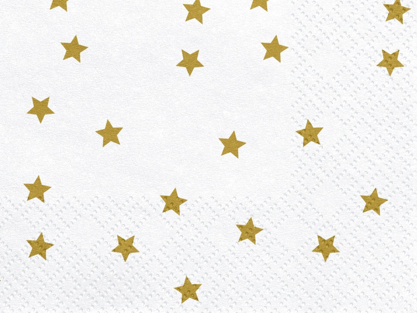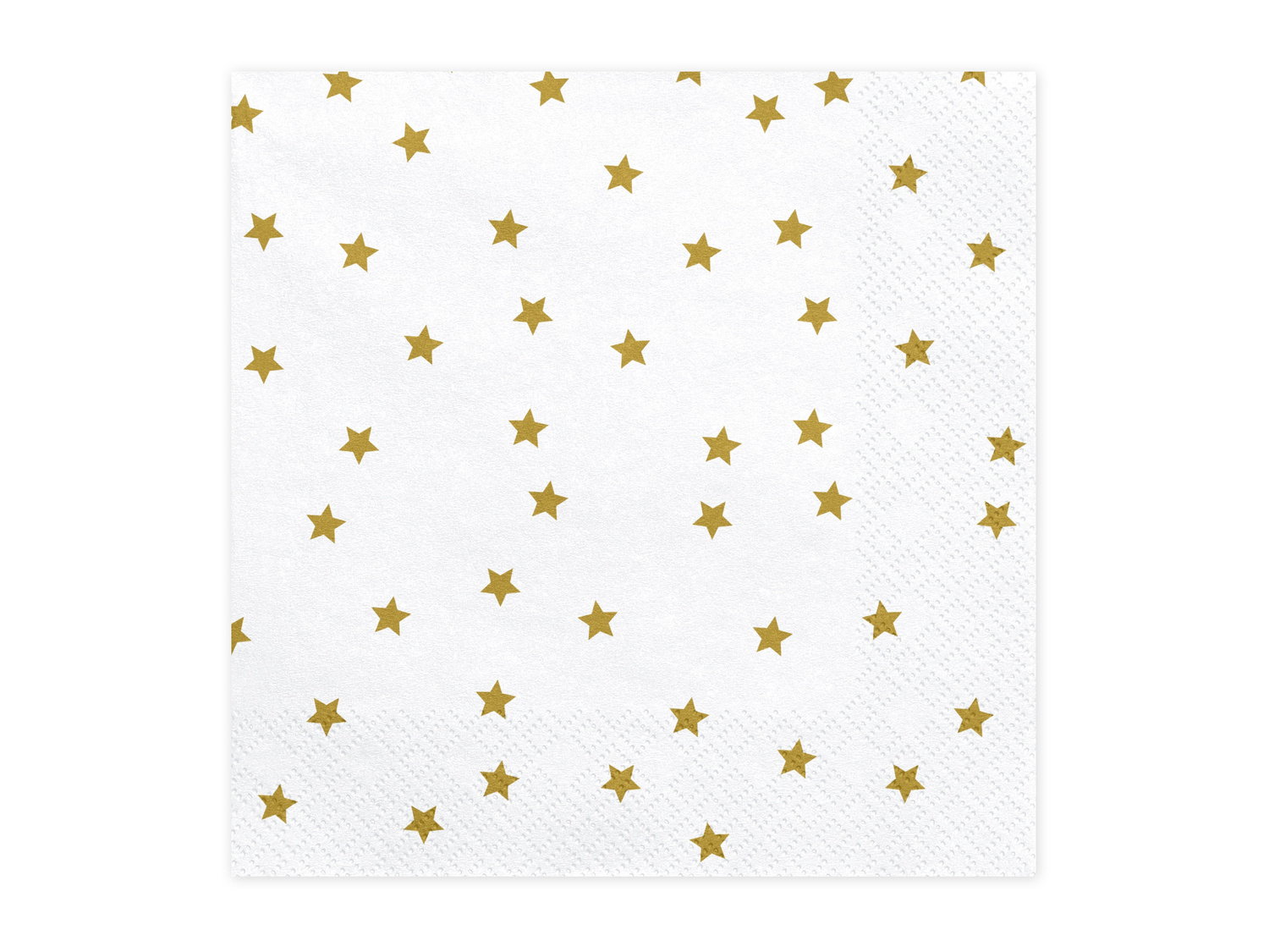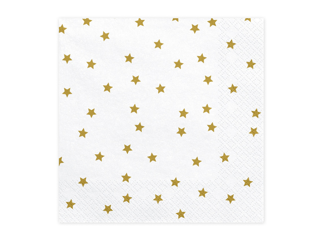 - Serwetki jednokolorowe w białym kolorze z nadrukiem złotych małych gwiazdek. Serwetki są 3 - warstwowe i mają rozmiar 33cm x 33cm.