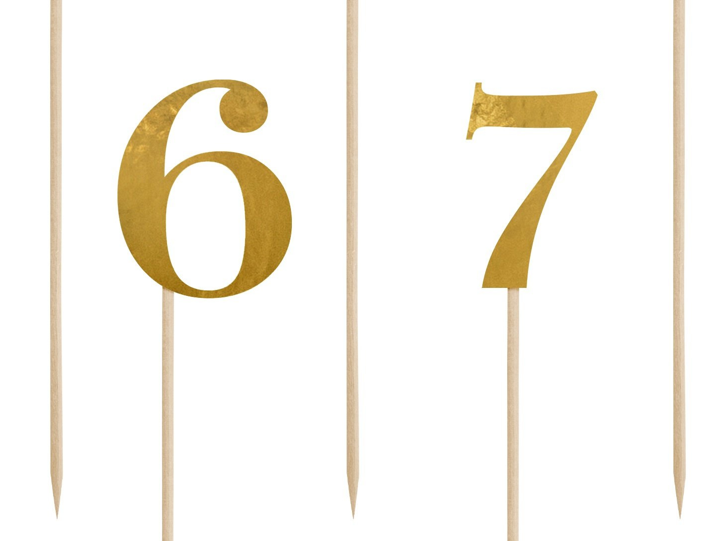 - Eleganckie pikery trzymające złote cyfry w lustrzanym kolorze. Wykałaczki wykonane są z drewna o długości 20cm. Znakomita dekoracja tortu, wypieków, koreczków, bukietów czy jako numeracja stołów na każdym eleganckim przyjęciu. W zestawie cyfry od 1 do 10.