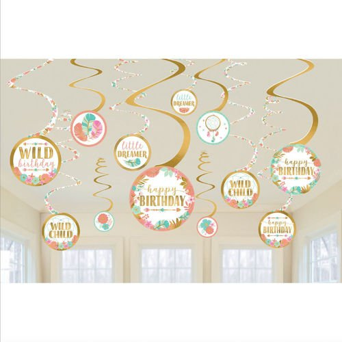 - Świderki dekoracyjne w kolorze delikatnego różu, mięty i brązu z zawieszkami. Na zawieszkach nadruki urodzinowe ozdobione kwiatami i piórkami. Znakomite na letnie przyjęcia urodzinowe w stylu boho.