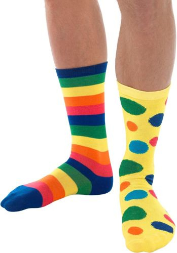 - Skarpetki do przebrania klauna lub żartownisia. Każda skarpetka ma inny wzór: jedna jest żółta w kolorowe groszki różnej wielkości, druga jest w poziome paski. Skarpety posiadają wyprofilowaną piętę i elastyczny ściągacz. Rozmiar uniwersalny.