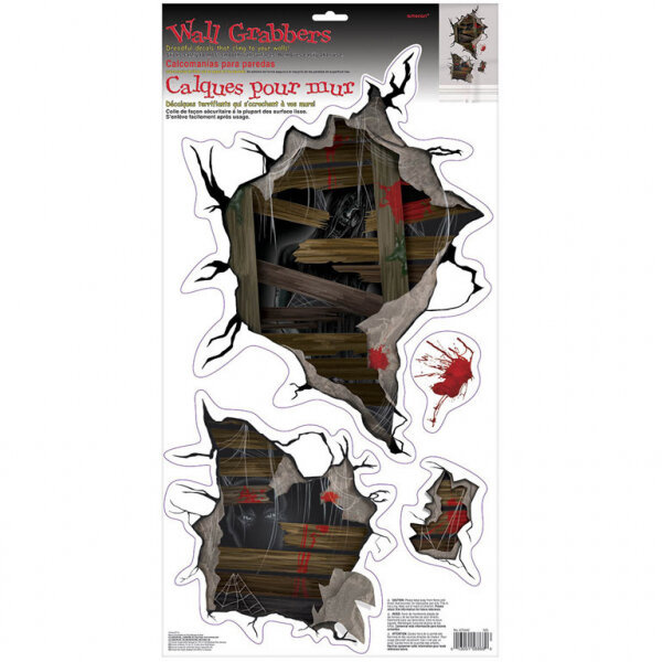 Dekoracja na Halloween i każde upiorne przyjęcie. Naklejka wykonana jest z przeźroczystego tworzywa, prezentuje widok pękniętej ściany przez którą widać połamane deski konstrukcyjne. Dechy pokryte są pajęczynami oraz śladami krwi. W oddali wyłania się postać przerażającego upiora / zombie. Naklejka przeznaczona na ścianę oraz każdą gładką powierzchnię, znakomita na okno lub lustro. Nie posiada kleju, łatwo się zakłada i zdejmuje.