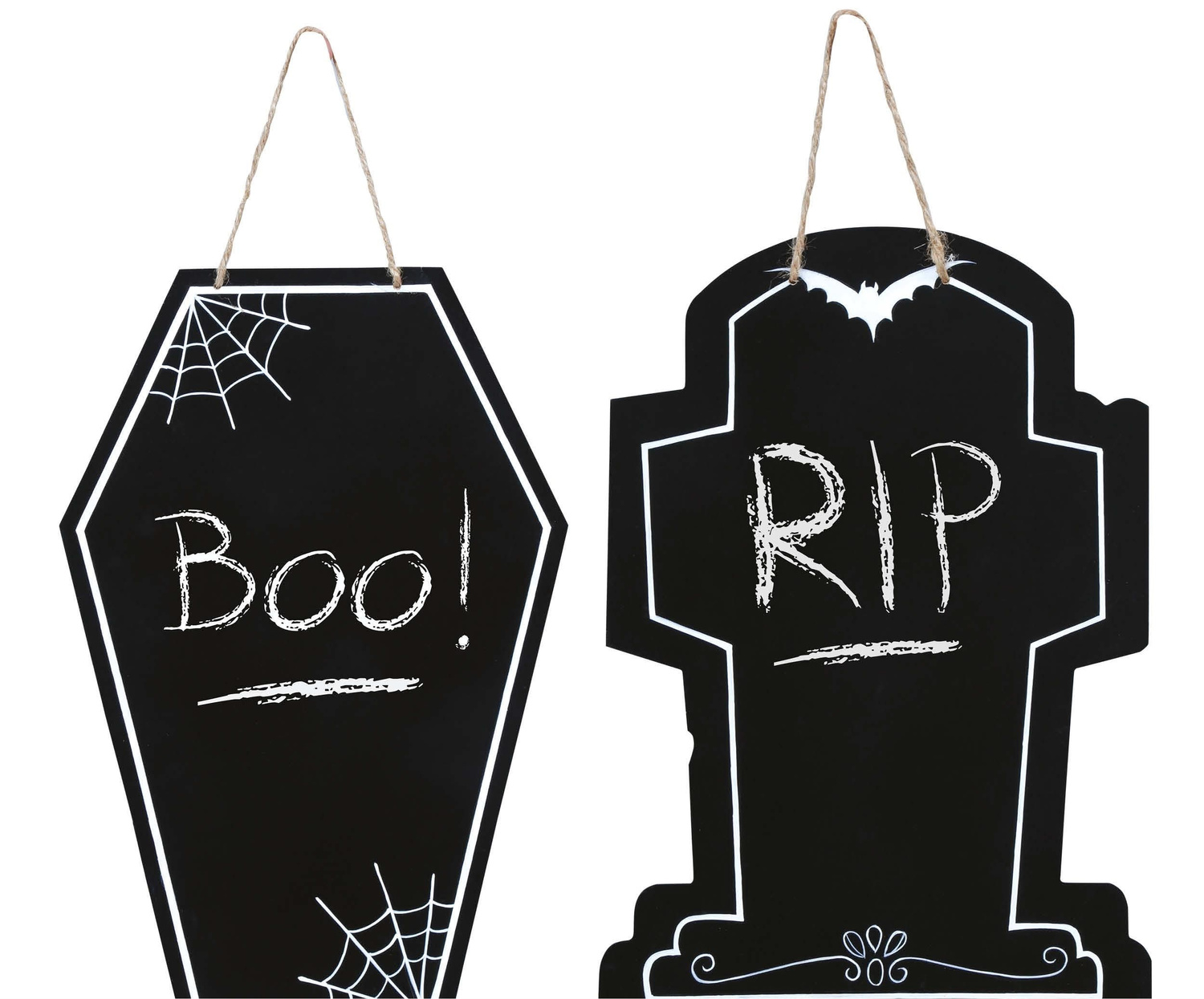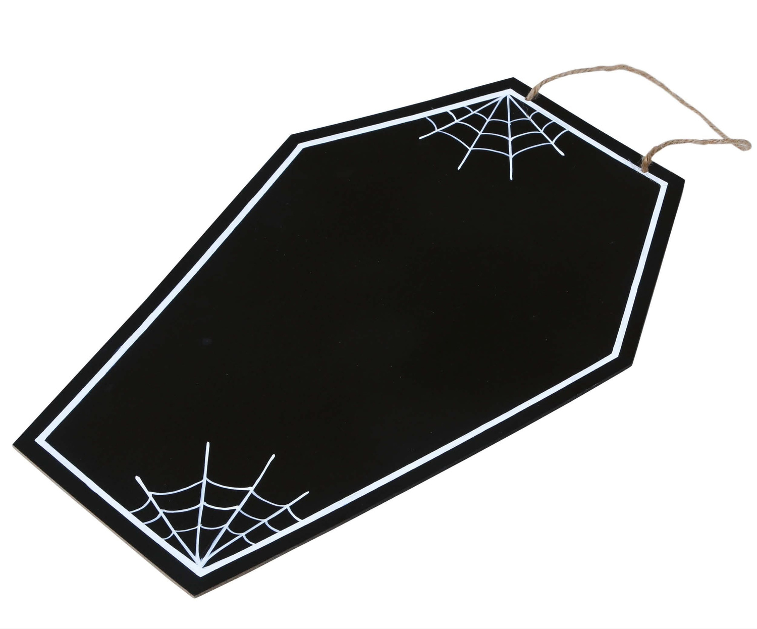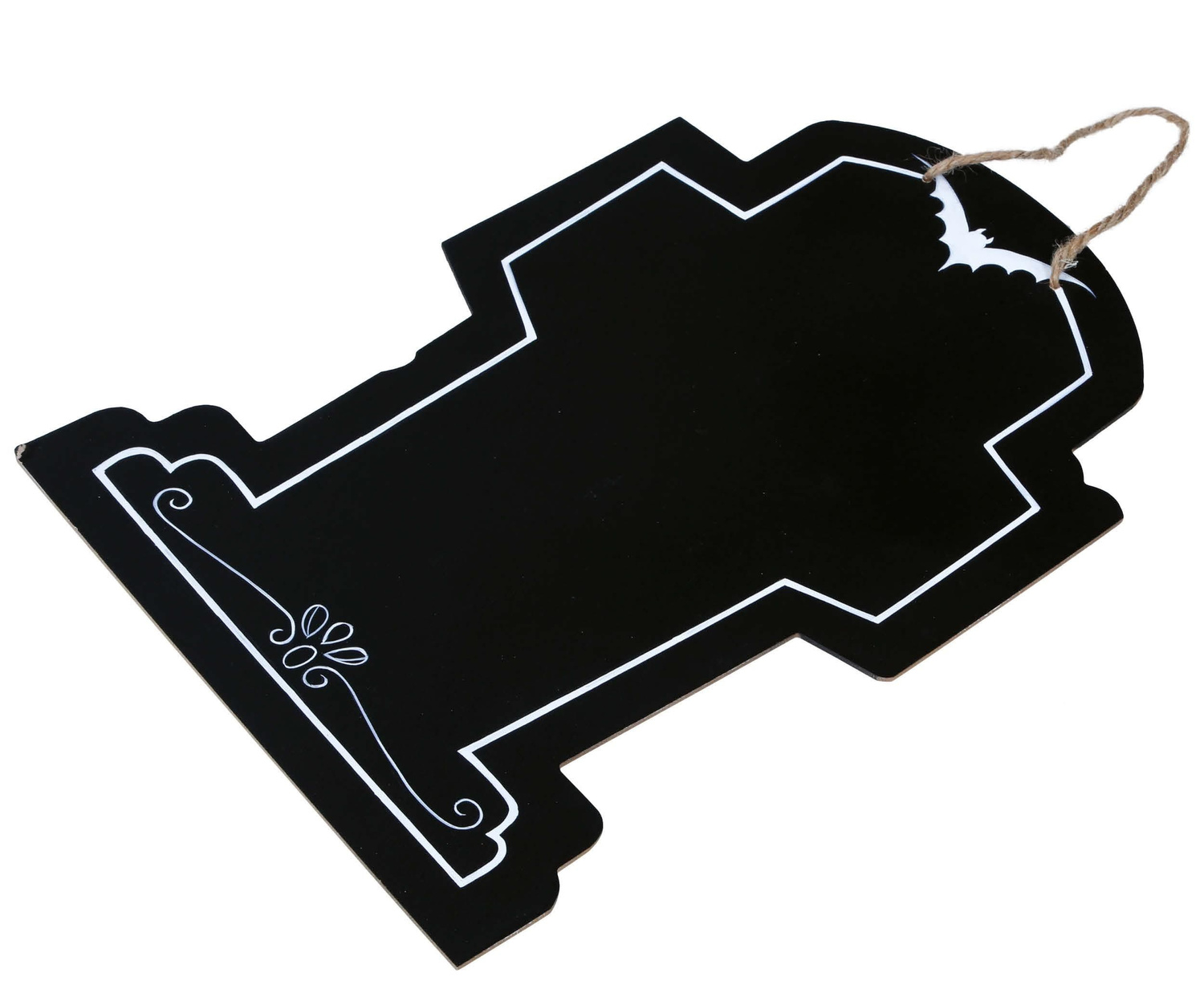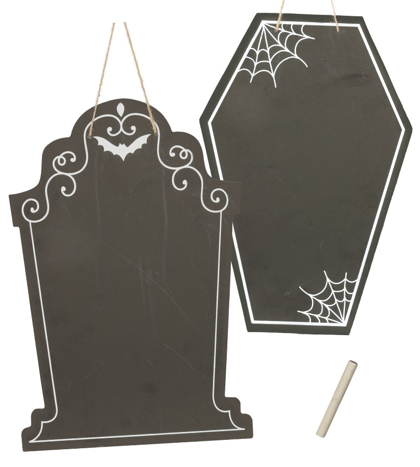 • Drewniana płyta z jednej strony pokryta czarną farbą tablicową. Tablica ma kształt nagrobka lub trumny wampira. Dookoła ozdobiona jest białą farbą. Do tablicy przyczepiony jest sznurek za który można ją powiesić. W zestawie dołączona biała kreda.