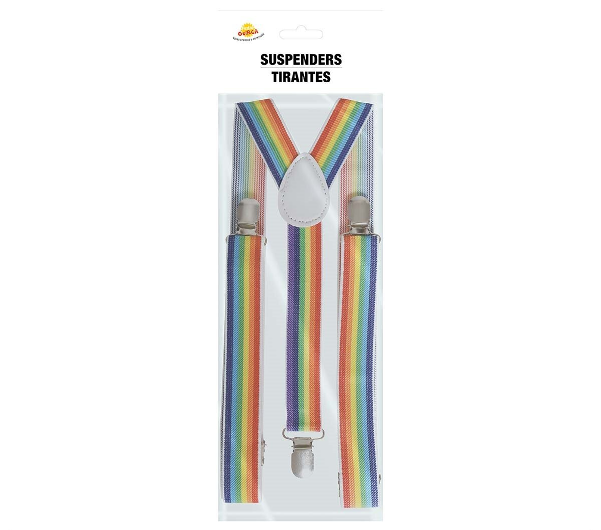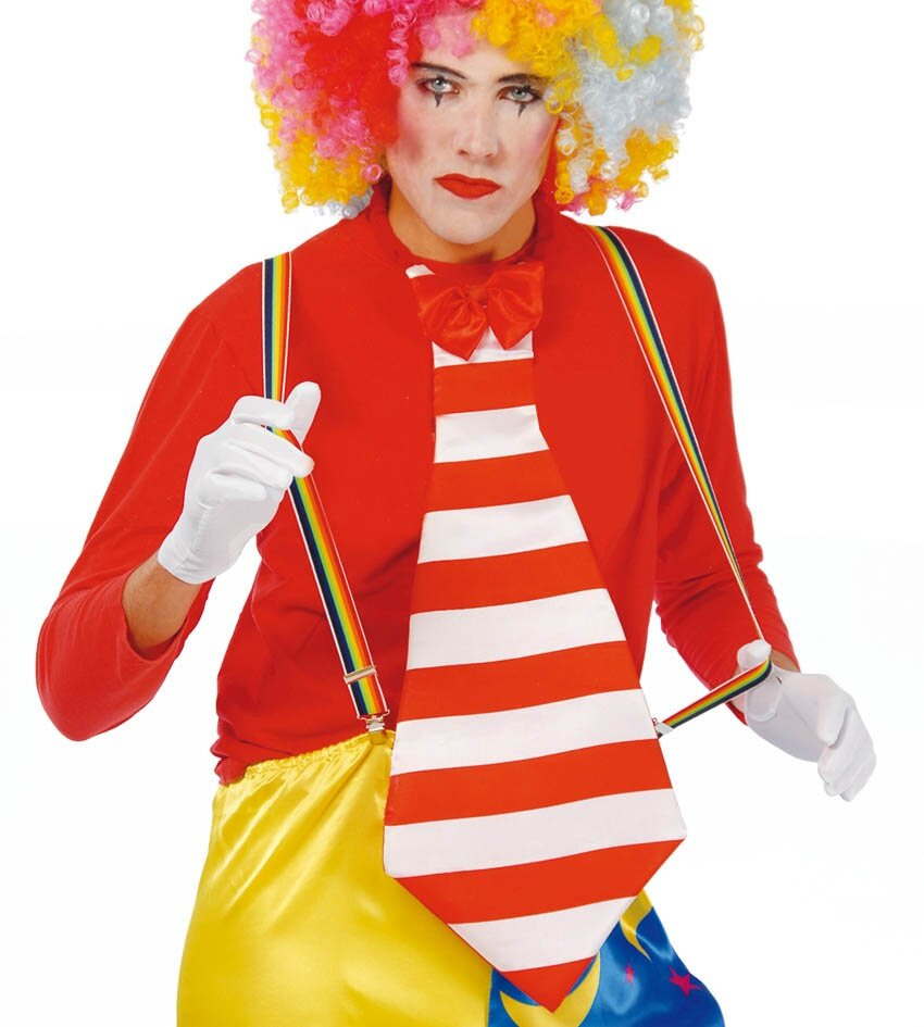 Kolorowe szelki wykonane z gumy o szerokości 2,5 cm. Posiadają dwie metalowe spinki z przodu oraz jedną z tyłu. Super dodatek do stroju klauna lub krasnala na końcu tęczy. Szelki posiadają regulację długości z przodu.