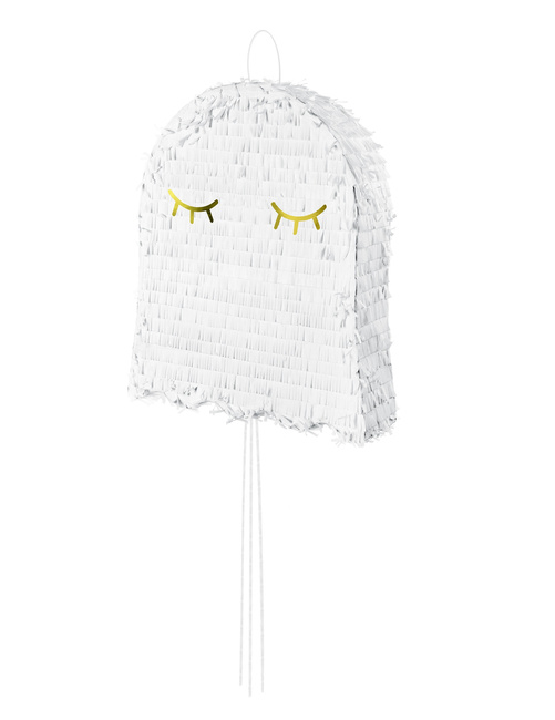 Piniata na słodycze to tekturowy duszek ozdobiony białą krepą. Z jednej strony naklejone są złote powieki z rzęsami. Do środka można włożyć drobne zabawki, prezenciki lub słodkości o wadze do 1kg. Zawartość uwalnia się poprzez pociągnięcie za białe wstążki. Znakomita zabawa na Halloween.