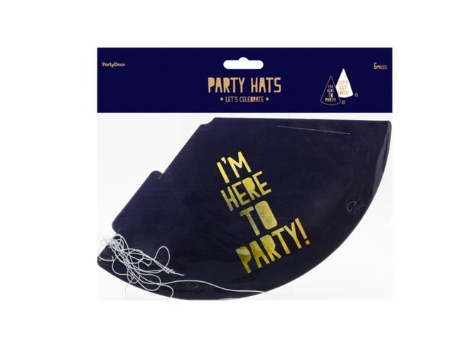 - Kapelusiki tekturowe jednobarwne w 2 kolorach: granatowym i białym. Na czapeczkach widnieje złoty lustrzany nadruk: "I'm here to party!" lub "Let's get toasty". Każdy kapelusik posiada gumkę, wymagają samodzielnego złożenia - wysyłane na płasko.