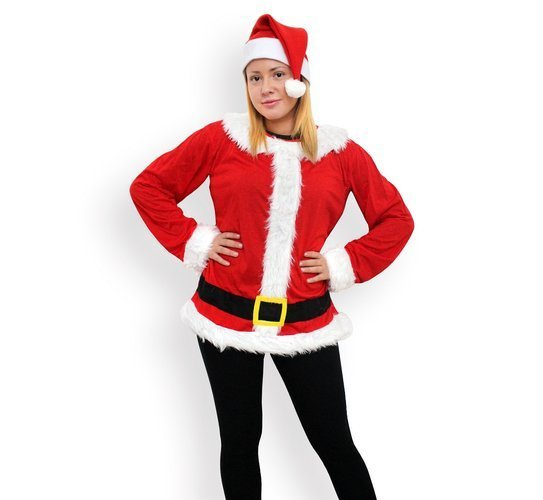 • Czerwona bluzka z długim rękawem obszyta białym futerkiem. Przebranie dopełnia czapka wykończona białym futerkiem z pomponem. Wygodny strój zarówno dla kobiety jak i mężczyzny na świąteczny czas. Znakomita do noszona na co dzień.