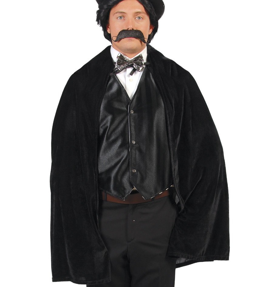 - Czarna peleryna do stroju wampira, Draculi, Batmana, magika czy angielskiego lorda. Wykonana z weluru, bez kaptura. Długość całkowita 100 cm