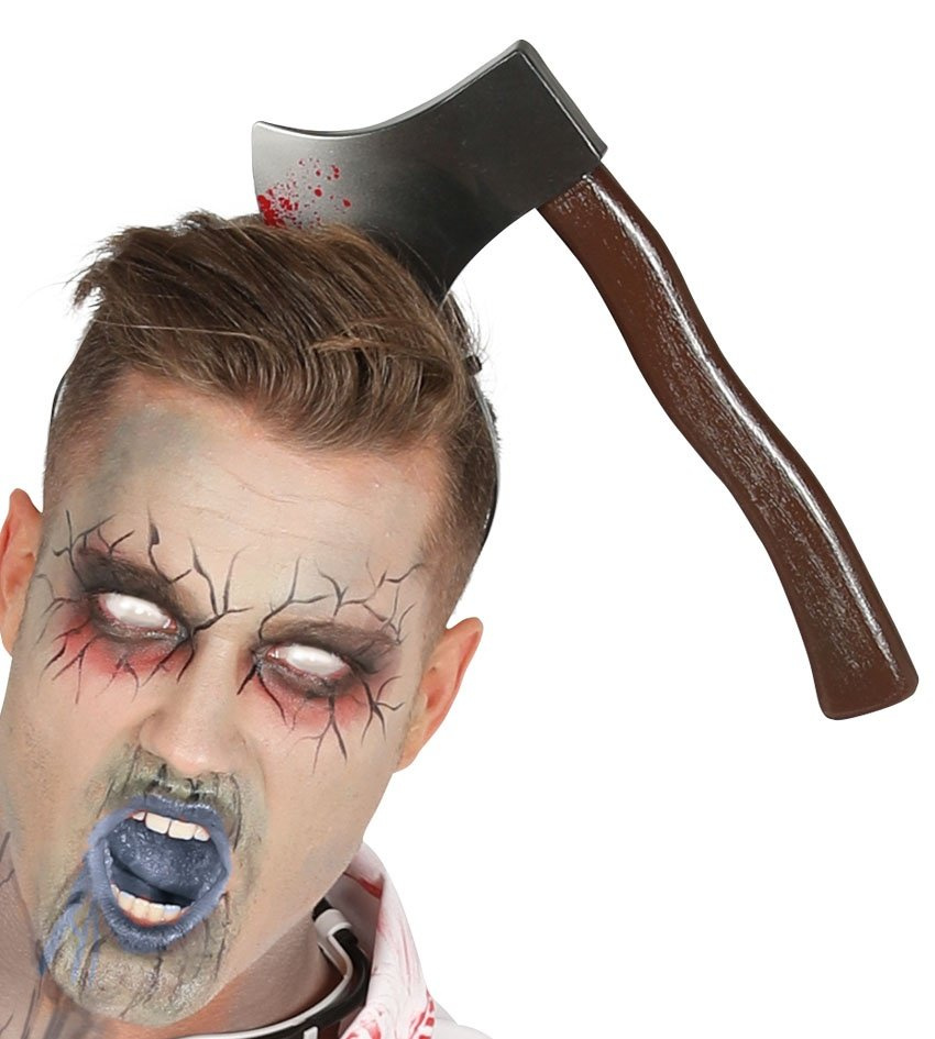 - Plastikowa opaska do włosów w czarnym kolorze. Do opaski przyczepia się siekierę ubrudzoną sztuczną krwią. Opaska jest jednostronna (nadruk z jednej strony, tył pusty). Znakomita do charakteryzacji halloweenowej, wyglądała jak wbity toporek w głowę.