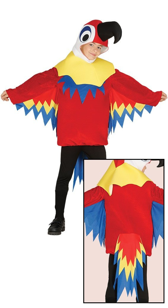 Kostium ptaka - Papugi w intensywnych barwach. Przebranie składa się z czerwonej bluzy dodatkowo wypchanej na brzuszku dla objętości. Bluzka posiada długie rękawy pod którymi doszyty jest niebiesko - żółto - niebieski materiał imitujący skrzydła. Na tyle przymocowany kolorowy, materiałowy ogon. Przy szyi przyszyty niebieski kołnierz. Bluza posiada ściągacz na dole. Kostium dopełnia kaptur z dużym czarnym dziobem. Kaptur jest usztywniony i posiada żółty kołnierz, który opada na ramiona.