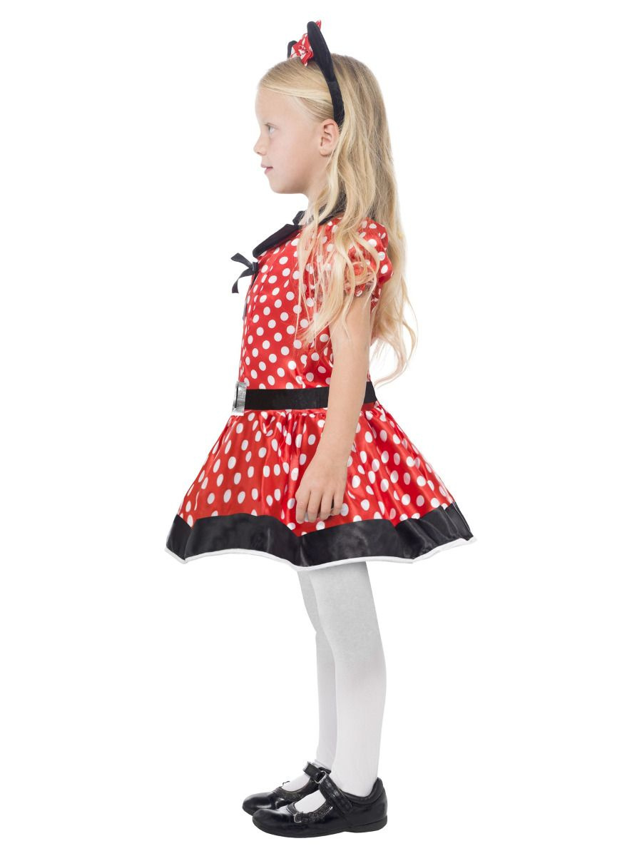 Strój Myszki Minnie składa się z sukienki z  krótkim rękawem. Rękawki są w kolorze czerwonym z białymi kropkami, zakończone gumkami. Kołnierz, środek klatki piersiowej oraz pas z kokardą wykonane są z białego materiału przypominającego satynę. Czarne, welurowe boki ozdobione są linią czerwonych cekin. Na środku nadrukowana postać Myszki Minnie. Dół sukienki posiada dwie warstwy, wewnętrzną - błyszczącą w kolorze czerwonym z białymi kropkami oraz zewnętrzną - czerwoną siateczkę wykończoną czarną nitką.