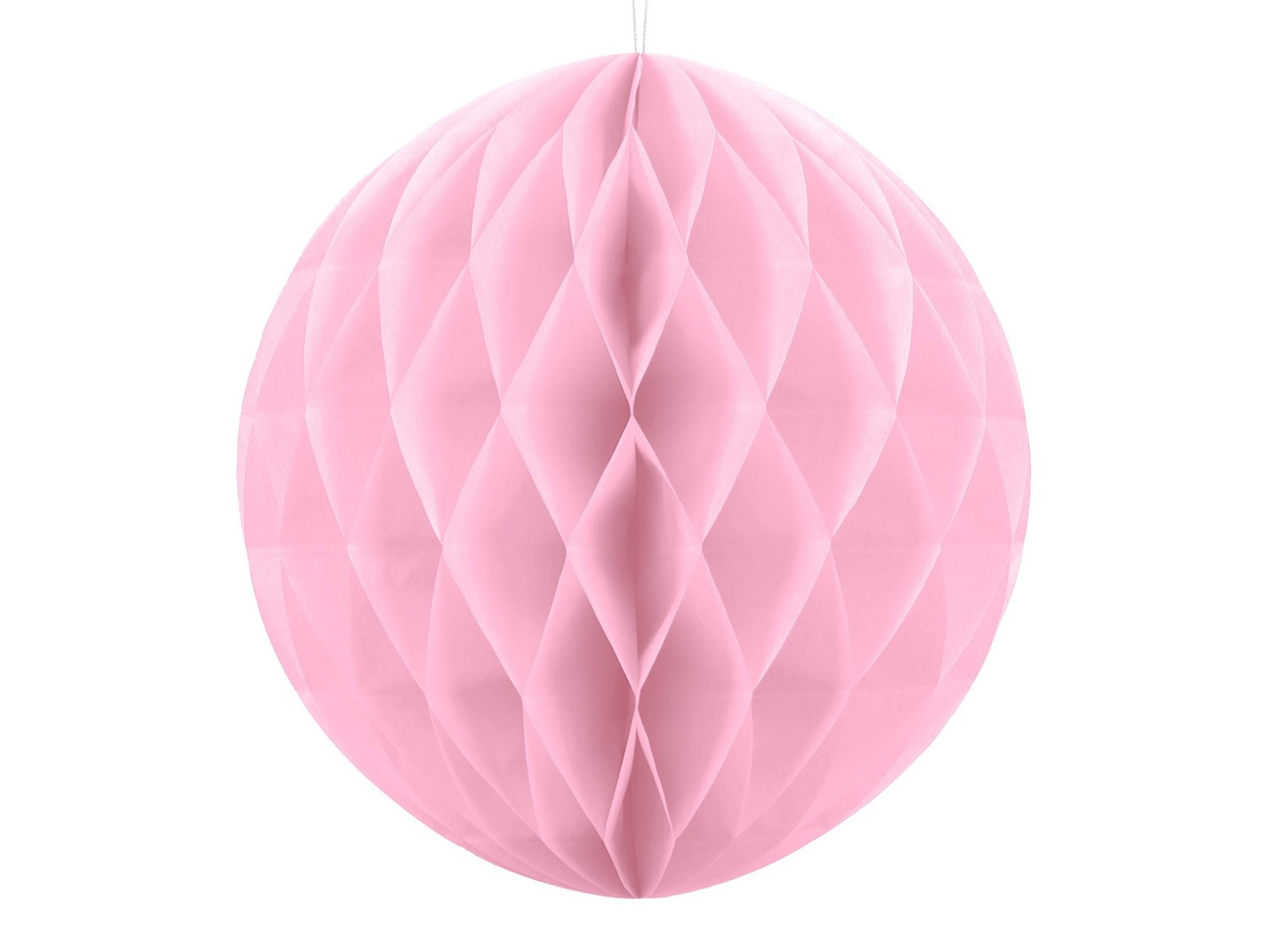 Bardzo efektowna rozetka tekturowa do powieszenia w domu pod sufitem, lampą, w oknie lub nad łóżeczkiem nowego członka rodziny. Rozeta ma kształt kuli. W całości wykonana jest z bibuły w różowym kolorze w jasnym odcieniu, wygląda jak plaster miodu.