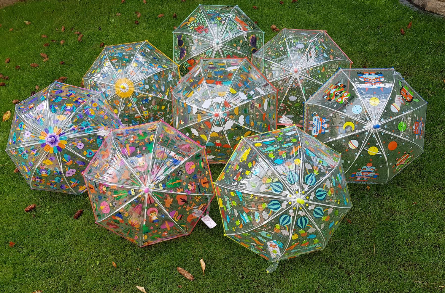 - Parasol dziecięcy z przeźroczystego tworzywa z kolorowym nadrukiem. Rączka oraz zakończenie w kolorze czerwonym. Parasolka posiada plastikowe grzybki na zakończeniach drutów dla bezpieczeństwa. Rozkładana przez suwanie.