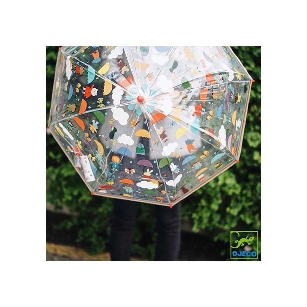 Parasol dziecięcy z przeźroczystego tworzywa z kolorowym nadrukiem zwierzątek spacerujących z parasolkami w deszczu. Rączka oraz zakończenie w kolorze czerwonym. Parasolka posiada plastikowe grzybki na zakończeniach drutów oraz system zabezpieczający przed przycięciem paluszków. Rozkładana przez suwanie. Parasolka jest lekka, znakomita dla przedszkolaków i dzieci wczesnoszkolnych. Dzięki transparentności dzieci mogą obserwować spadające krople deszczu, a jednocześnie czerpać radość ze spaceru w niepogodę.